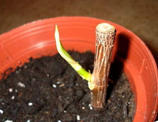Горизонтальное укоренение. Этот способ отличается тем, что стеблевые черенки не втыкают в субстрат, а выкладывают их горизонтально на влажный грунт, слегка вдавливая их. Сверху черенки необходимо прикрыть пакетом, чтобы создать условия теплички. По мере роста побегов укорененный кусочек стебля начнет разрушаться, поскольку все питательные вещества уйдут на образование корней и молодых отростков.